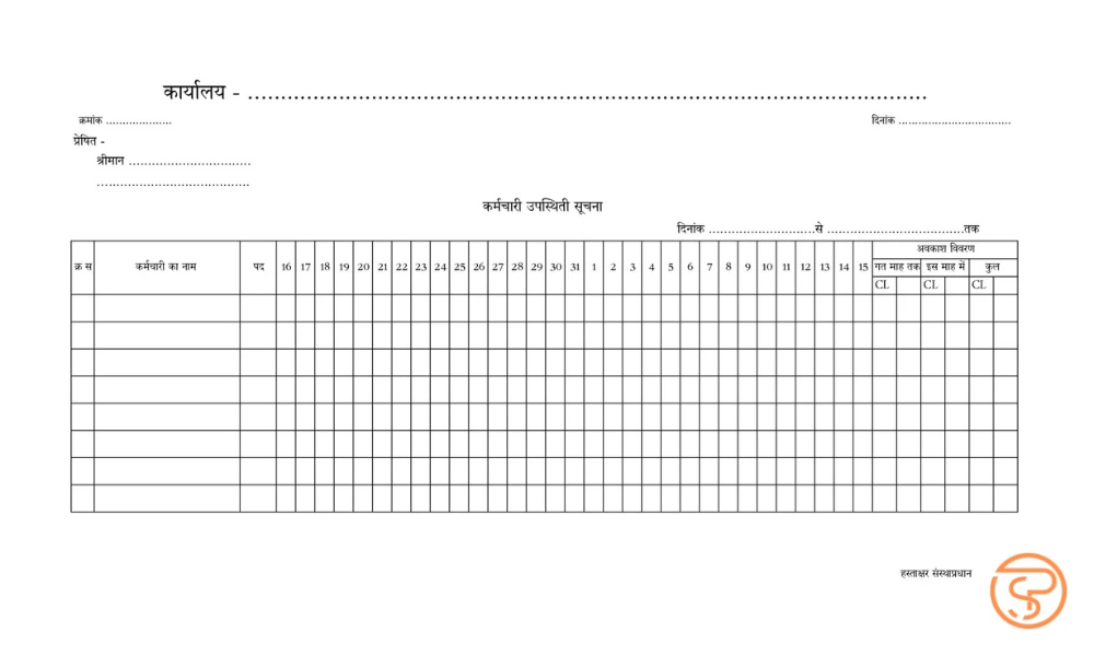अंतिम कॉलम: “कुल उपस्थित दिवस”, “कर्मचारी हस्ताक्षर”।